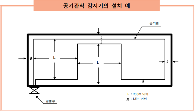 공기관은 벽면에서 너무 멀리 떨어지지 않도록 1.5m 이하의 거리를 두고 공기관간의 간격은 내화구조 또는 비 내화구조에 따라 그림과 같이 일정거리 이내로 해야 한다.