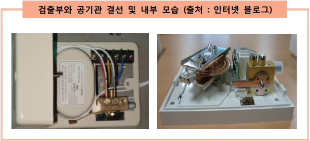검출부가 그림의 오른쪽 그림과 같이 기울어지면 감지기 내부의 다이아프램의 팽창감도에 영향을 줄 수 있으므로 항상 바닥면과 수직을 이루도록 설치해야 한다.
