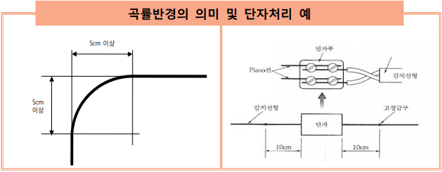 1. 감지선형 감지기 연결은 단자부를 사용하고, 이 때 감지선형에 장력이 발생하지 않도록 고정금구를 이용한다. 2. 감지선을 구부려야 하는 경우에는 직각으로 꺾지 말고 그림과 같이 5㎝이상의 곡률반경을 두어 감지선내부의 용융물질 등이 손상되지 않도록 하여야 한다.(곡율반경 5cm가 아래와 같은 형태가 아닐수도 있으므로 반경=반지름=5cm의 개념으로 봐야 한다)