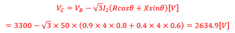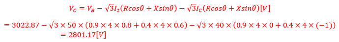 (2) C점에 전력용 콘덴서를 설치하여 진상 전류를 40 [A]를 흘릴 때 B점과 C점의 전압은 각각 몇 [V]인가?