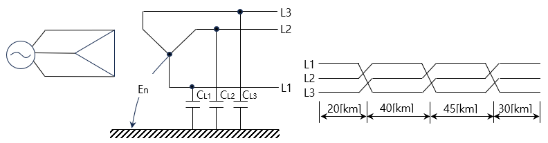 154 [kV]의 송전선이 그림과 같이 연가되어 있을 경우 중성점과 대지 간에 나타나는 잔류 전압을 구하시오. (단, 1 [km] 당의 대지 정전 용량은 맨 윗선 0.004 [uF], 가운뎃선 0.0045 [uF], 맨 아랫선 0.005 [uF]라고 하고, 다른 선로 정수는 무시한다.)