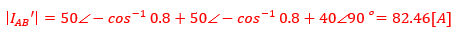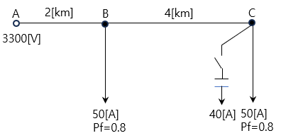 그림과 같은 3상 배전선에서 변전소(A점)의 전압은 3300 [V], 중간(B점)지점의 부하는 50 [A], 역률 0.8(지상), 말단(C점)의 부하는 50 [A],역률 0.8이고, A와 B사이의 길이는 2 [km], B와 C 사이의 길이는 4 [km]이며, 선로의 [km] 당 임피던스는 저항 0.9 [Ω],Ω], 리액턴스 0.4 [Ω]이라고Ω] 할 때 다음 각 물음에 답하시오.