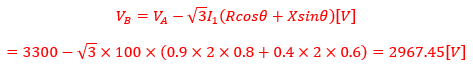 (2) C점에 전력용 콘덴서를 설치하여 진상 전류를 40 [A]를 흘릴 때 B점과 C점의 전압은 각각 몇 [V]인가?
