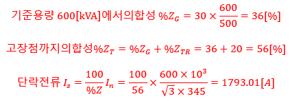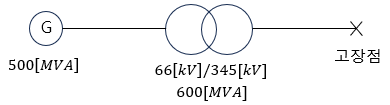 66 [kV], 500 [MVA], %임피던스 30 [%]인 발전기에 용량이 600 [MVA], %임피던스 20 [%]인 변압기가 접속되어 있다. 변압기 2차 측 345 [kV]지점에 단락이 일어났을 때 단락 전류는 몇 [A]인가?