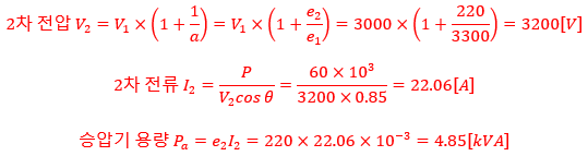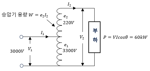 단자전압 3000[V]인 선로에 전압비가 3300/220 [V]승압기를 접속하여 60[kW], 역률 0.85의 부하에 공급할 때 몇 [kVA]의 승압기를 사용하여야 하는가?