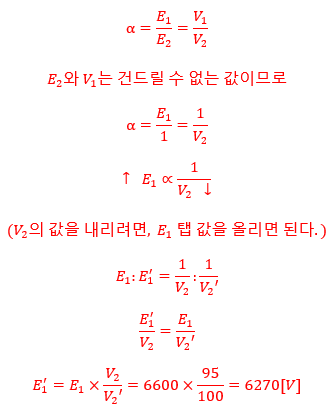주상 변압기의 고압 측의 사용탭이 6600 [V]인 때에 저압 측의 전압이 95 [V]였다.저압 측의 전압을 약 100 [V]로 유지하기 위해서는 고압 측의 사용탭은 얼마로 하여야 하는가? (단, 변압기의 정격전압은 6600/105 [V]이다.)