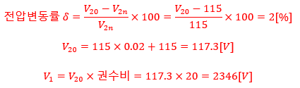 단상 변압기가 있다. 전부하에서 2차 측 전압이 115 [V] 일 때, 전압변동률이 2 [%]였다면 1차 측 단자전압은 얼마인지 구하시오. (단,변압기 권수비는 20:1이다.)