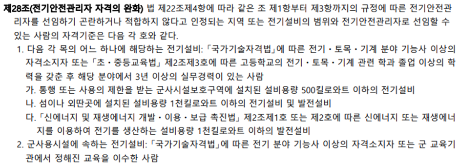 전기안전관리법 시행규칙 제28조(전기안전관리자 자격의 완화)