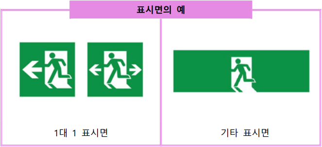 3. 유도등의 표시면은 국제표준화기구(ISO)의 기준에 의한 그림문자로 하며, 식별 이 용이하도록 비상문·비상탈출구·EXIT·FIRE EXIT 또는 화살표 등과 함께 표시할 수 있다. 다만, 계단통로유도등은 표시면을 설치하지 아니할 수 있다. 가. 표시면에 사용되는 사람 모양의 국제표준화기구(ISO) 그림문자는 피난방향을 표시하는 것이 아니라 피난구를 표시하는 심벌이다. 나. 피난방향을 표시하는 경우에는 화살표를 병기하여 표시할 수 있다.