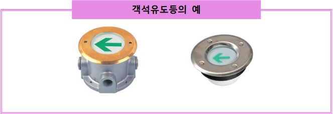 1.객석유도등은 객석의 통로, 바닥 등에 설치하고 화살표를 병기하여 피난구의 방향을 명시하고 있는 전등(電燈)이다. 객석유도등은 비상전원을 점검할 수 있는 점검스위치를 설치하지 않을 수 있다. 2. 객석유도등의 제품 내부에 비상전원(축전지) 및 예비전원 감지장치를 설치하지 아니할 수 있으며, 별도의 외부 전원장치를 사용하여 비상전원을 공급할 수 있다.