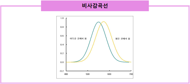 4. 표시면의 색상은 녹색으로 표시하고 있다. 이는 주위 조명상태가 밝은 상태에 서 낮은 상태로 변화 시 최고로 민감하게 반응하는 색상이 녹색이기 때문이다. 가. 화재 시 정전사고가 발생하거나 연기 등이 체류하게 되면 밝은 상태에서 어 두운 상태로 주위 조도가 변화하게 된다. 이때는 밝은 상태에서 식별이 용이 한 적색보다는 오히려 단파장인 녹색의 식별도가 높게 되는 특성을 이용한 것이다. 나. 강한 태양빛에서 제라늄꽃(허브과 꽃)은 다소 흐릿한 녹색의 잎사귀나 주위의 파란색 꽃에 대비해 밝은 빨간색을 나타낸다. 그러나 해가 질 때 즈음에 는 이 색 대조가 뒤바뀌어 빨간 꽃잎은 다소 어두워지고 상대적으로 잎과 파란 꽃잎은 밝은 빛을 띠게 된다. 이와 같이 주위 조명상태가 어두운 조명 상태로 변화될 경우 인간의 눈은 단파장인 푸른 계열의 색에서 최고 휘도의 민감성을 나타내게 된다. 이러한 현상을 푸르키녜 효과(Purkinje effect)이라 한다. 다. 망막의 시세포는 밝은 곳에서는 주로 원추세포가, 어두운 곳에서는 간상세포 가 작용하므로, ‘밝은 곳의 시감도’와 ‘어두운 곳의 시감도’의 2종류로 구별된다. ‘밝은 곳의 시감도’에서는, 파장 약 555 ㎚에서 최대 감도가 되며, ‘어두운 곳의 시감도’에서는 간상세포의 감도가 파장 510 ㎚로 최대가 되며, 청색 빛에 대한 감도가 높다. 이 때문에 어두워짐에 따라 최대 감도는 황록색에서 청색으로 이동하여, 적색은 어두운 것으로, 청색은 밝은 것으로 감각된다. 라. 「미국 NFPA 101(인명안전기준)」부록에서는 표시면의 색상 명확히 규정화하고 있지 않지만 대부분의 경우에는 적색과 녹색을 사용하 고 있다. 5. 유도등은 표시면의 크기와 휘도에 따라 대형, 중형, 소형으로 구분하며, 설치방 법에 따라 매립형과 돌출형으로 구분한다. 가.표시면의 크기에 따라 구분된 대형, 중형, 소형은 가로와 세로의 크기가 같은 1대 1 표시면과 가로의 크기와 세로의 크기가 다른 기타 표시면으로 구분된다. 나. 설치방법 따라 전원부가 천정면 또는 바닥면에 매립되는 매립형과 전원부가 매립되지 않고 돌출형으로 구분된다.