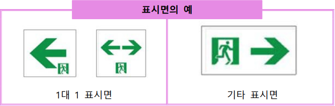 2. 통로유도표지의 표시방법은 표시면의 색상은 백색(엷은 연두색, 엷은 황색) 바탕에 녹색문자로 표시한다. 3.「축광표지의 성능인증 및 제품검사의 기술기준」에서는 피난구 및 통로유도표지뿐만 아니라 피난로 등의 바닥 · 계단 · 벽면 등에 설치함으로써 피난방향 또는 피난설비 등의 위치를 알려주는 보조역할의 “보조축광표지”를 규정하여 다양한 방법의 피난유도를 확보할 수 있도록 기준화하고 있다.