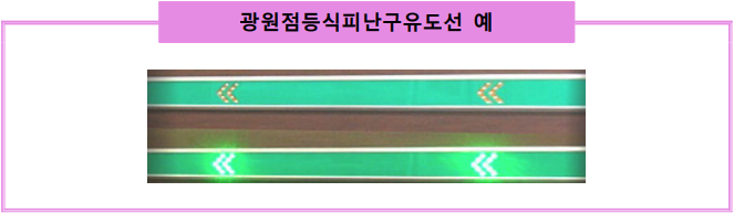 1. 축광식 피난유도선은 전원의 공급 없이 전등 또는 태양 등에서 발산되는 빛을 흡수하여 이를 축적시킨 상태에서 전등 또는 태양 등의 빛이 없어지는 경우 일정시간 동안 발광이 유지되어 어두운 곳에서도 피난유도선에 표시되어 있는 피난방향 안내 문자 또는 부호 등이 쉽게 식별될 수 있도록 함으로써 피난을 유도하는 기능의 피난유도선을 말한다.