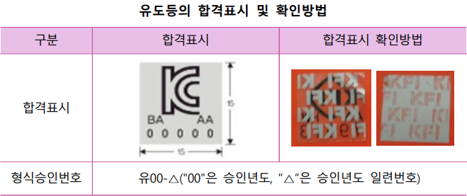 6. 유도등의 제품검사 합격 여부를 확인하는 방법은 형식승인번호 및 합격표시(은 색바탕 흑색 심벌 및 글자) 등의 유무로 확인할 수 있다. 가. 형식승인을 획득한 제품은 형식승인번호를 부여하고 형식승인번호 등의 제 원을 제조명판에 표시하도록 하고 있으며, 제품검사에 합격한 제품은 합격 표시를 부착하고 있다. 나.합격표시를 확인하는 방법으로는 합격표시를 떼어내게 되면 제품에 부착된 상태로 「KFI」라는 음각된 문구가 표시되고 떼어진 투명바탕에도 「KFI」라는 비표시가 표시된다. 다. 합격표시와 확인표시 1) 합격표시 『화재예방, 소방시설 설치유지 및 안전에 관한 법률』 제36조에 따라 형식승인 대상 소방용품에 대하여 합격된 제품에 부착하는 표시를 말한다. 2) 확인표시 제품과 별도로 분리된 부속품에 부착하여 합격제품과 다른 제품으로 교체되는 것을 방지하기 위한 표시 가) 예비전원, 탐지부, 공기관, 수광부, 수신부, 작동장치 소화약제의 포장에 따른 확인표시 부착- 분말 : 포장지(비닐대)의 목 부위를 감아서 봉인 나) 액체계소화약제 : 내용물을 임의 교체할 수 없도록 개봉 시 파괴되는 구조로 주입구 뚜껑 또는 뚜껑과 용기 결합부에 봉인 다) 가스계소화약제 : 파괴구조의 뚜껑 혹은 가열비닐 처리한 경우 표면 또 는 용기 결합부에 봉인