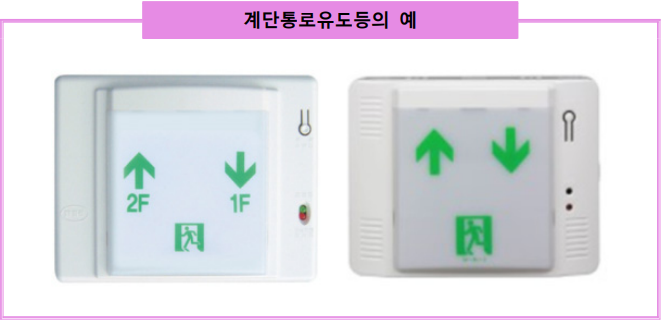 2. 2010년 이전에는 계단통로유도등으로 형식승인을 받은 제품이 없어서 복도통로유도등의 표시면만 바꾸어 계단통로유도등으로 사용되었다. 하지만 현재는 형식승인받은 제품이 출시되고 있으니 반드시 계단통로유도등으로 형식승인받은 제품을 설치해야 한다. 이는 계단통로유도등과 복도통로유도등의 조도기준이 상이하고, 사용목적이 다르기 때문에 구분하여 설치하여야 한다.