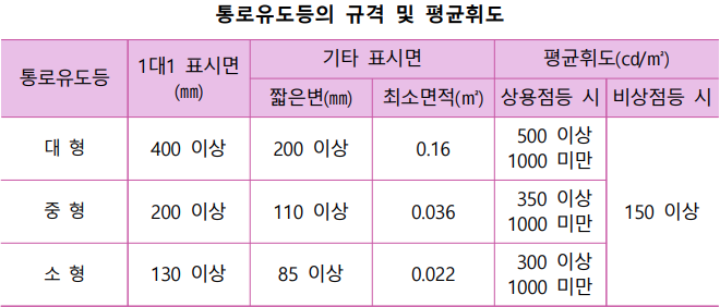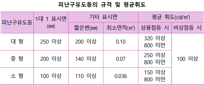 2. 통로유도등 표시면의 색상은 백색바탕에 녹색문자로 표시하며 크기와 휘도는 아래의 표와 같이 구분한다.
