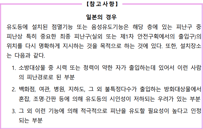 4.소방대상물 중 시력 또는 청력이 약한자가 출입하거나 혼잡성에 의하여 유도등의 시인성(표시내용 인지)의 저하가 우려되는 장소에는 점멸, 음성 또는 이와 유사한 방식 등에 의한 유도장치를 설치할 수 있으며, 피난구유도등의 표시면과 피난목적이 아닌 안내표시면이 구분되어 함께 설치할 수 있는 복합표시형유 도등이 있다. 가. 점멸 또는 음성유도장치가 내장된 유도등의 구조 및 기능은 다음과 같다. 1) 수신기나 감지기 등으로부터 화재신호를 수신하고 3 초3초 이내에 자동적으로 작동하여야 하며 화재복귀신호를 수신한 경우에도 3초 이내에 정지하여야 한다. 2) 점멸장치의 섬광은 투명색으로 4 W의 크세논램프가 분당 (60 ~ 180) 회 점 멸하고, 음향유도장치는 전면 1m에서 최소 70 ㏈ 이상으로 음량이 발신하여야 하며 음압조정은 90 ㏈ 이상 가능하여야 한다. 또한 경보음과 음성으 로 각각 2회 반복(예 : 뚜- 뚜-, 비상문은 이쪽입니다. 비상문은 이쪽입니다.)하여야 한다. 나. 복합표시형유도등은 피난목적이 아닌 안내표시면을 구분하여 설치할 수 있으나, 광고안내표지 등을 설치할 경우 유도등의 식별성 및 시인성을 저해할 수 있으므로 설치하지 않는 것이 합리적이다.