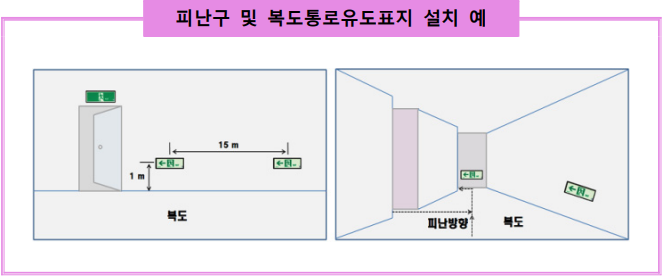 2.계단에 설치하는 통로유도표지를 제외하고 복도에 설치하는 복도통로유도표지는 바닥으로부터 1 m 이하로 보행거리 15 m 이하 및 구부러진 모퉁이 등의 위치에 설치한다.