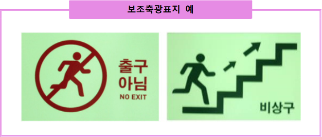 2.5.1.5 축광방식의 유도표지는 외광 또는 조명장치에 의하여 상시 조명이 제공되거나 비상조명등에 의한 조명이 제공되도록 설치할 것
