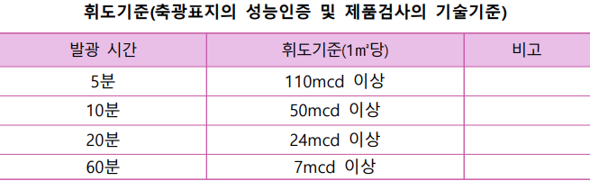 5. 「축광표지의 성능인증 및 제품검사의 기술기준」(국민안전처고시 제2015-62호, 2015.3.17.)에서는 0 ㏓ 상태에서 1시간 방치 후 200 ㏓ 밝기의 광원으로 20분간 조사시킨 상태에서 주위조도 0 ㏓로 하여 휘도를 측정하며 그때의 휘도 기준 은 아래의 표와 같다. 가. “발광시간”이란 유도표지를 일정시간 동안 빛에 노출시킨 후 빛을 제거한 상 태에서 유도표지 자체에서 빛을 발하고 있는 시간을 말한다.
