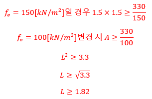 구조계산서에 의하면 허용지내력 fe=150[kN/m2]일 때 기초크기는 1.5[m] x 1.5[m]로 설계되었으나 현장에서 지내력 시험을 한 결과 fe=100[kN/m2]으로 측정되었다. 이 경우 변경 기초 크기의 면적은 몇으로 하여야 하는가? (단, 구조물에 걸리는 하중은 330[kN]이다.)