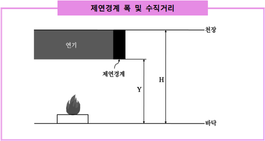 1. 수직거리 화재 시 급기량이 체류하는 공간으로 상기 그림에서 Y를 말하며, 통상 2m 이하 로 하며, 2m를 초과할 경우 배출량을 증가시켜야 한다.