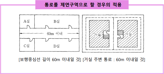 다. 바닥면적 1,000㎡ 이내로 설정하여야 함에도 직경(거실의 경우)의 길이나 보행중심선(통로의 경우)을 별도로 규제한 것은 바닥면적 이외에 형상을 규제하여 제연구역의 범위를 한정하도록 하기 위한 목적으로 통로의 경우는 보 행경로상의 중심선을 연장한 선이 60m 이내이어야 한다.