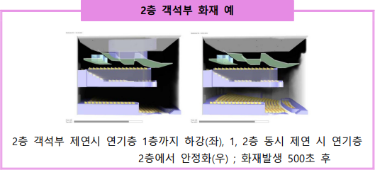 1.하나의 제연구역은 2개 이상층에 미치지 아니하도록 할 것(제5호 관련) 가. 하나의 제연구역은 층별로 설치하는 것을 원칙으로 한다. 그 이유는 연기와 화재의 확산을 최소화하여서 인명과 재산 피해를 최소화하려는 목적이다. 일반적으로 방화구획이 층별, 면적별, 용도별로 하는 것과 동일한 것이다. 나. 층별 구획의 다른 측면은 건축물을 수직으로 관통하는 계단, 승강로, 파이프 샤프트 등과 같은 수직개구부를 통한 연기의 전파를 방지해야 한다는 개념 과 연결된다. 2.다만, 층의 구분이 불분명한 부분은 그 부분을 다른 부분과 별도로 제연 구획하여야 한다. 가.화재시 연기가 전파하는 현상이 공간의 형상과 조건을 고려하여 제연구역을 설정하여야 한다. 나. 아트리움과 같이 여러 층을 관통하는 대공간이 건축물의 중심 또는 한쪽에 형성되는 경우는 아트리움 공간 전체를 하나의 제연구역으로 구획할 수 있다. 다.대공연장과 같이 하나의 공간이 관람석과 무대로 구분되는 경우가 있다. 이 경우에 무대가 방화천 또는 방화막과 같이 화재시에 화염과 연기를 완전히 차단할 수 있는 경우에는 별도의 제연구역으로 구분하여야 한다. 또한 관람 석이 여러 층에 걸쳐서 큰 대공간 내부에 있는 경우에는 관람석 전체를 하나의 구역으로 하는 것이 실제 연기제어의 효과를 높일 수 있다. 아래 그림 은 3층 객석을 가진 대공연장의 화재시뮬레이션 결과이다. 이 결과에서 객 석 또는 무대에서 화재가 발생하는 2가지 경우 모두에서 객석부를 층의 구분이 없이 가장 높은 공간을 기준으로 하나의 구역으로 연기를 배출하는 것 이 연기제어에 효과적임을 보여주고 있다. 라. 스크린도어가 설치된 지하철 역사의 승강장은 대합실과 연결되는 계단은 비 록 계단에 제연경계벽이 설치되어 있지만 방화구획이 되지 않아서 ‘하나의 제연구역은 2개 이상의 층에 미치지 않아’야 한다는 기준에 미흡할 수 있다. 따라서 연기가 대합실로 전파하는 것을 방지하기 위한 방법으로 승강장을 구분하여 상호제연하는 기존 방식보다는 대합실을 급기하고 승강장에서 배 기하는 등의 방식을 고려해야 한다.