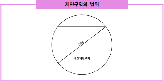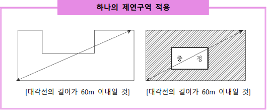 2. 하나의 제연구역은 직경 60m 원내에 들어갈 수 있을 것 (제4호 관련) 가. 이 의미는 제연구역의 외곽선의 대각선에 대해, 가장 긴 대각선이 60m 이내 가 될 경우 해당 구역이 60m의 원에 내접(內接)하게 되며 이는 하나의 제연 구역의 최장 대각선의 길이가 60m 이내로 되어야 한다는 뜻으로 제연 구역의 형태를 제한하기 위한 것이다.