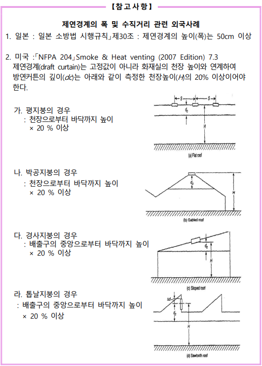 2.1.2.2 제연경계는 제연경계의 폭이 0.6 m 이상이고, 수직거리는 2 m 이내이어야 한다. 다만, 구조상 불가피한 경우는 2 m를 초과할 수 있다.