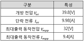 다음과 같은 특성을 가지는 태양전지 모듈의 기온이 40[℃]일 때 개방전압 를 구하시오.