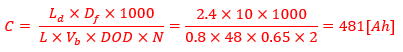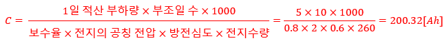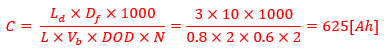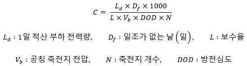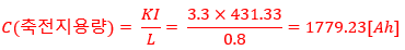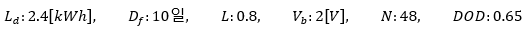 | [조건] 1일 부하 적산량(Ld) : 3[KWH] 보수율(L) : 0.8 일조가 없는 날의 일수(Df) : 10일 축전지 개수(N) : 50개 DOD : 0.6 공칭 축전지 전압 : 2[V] |