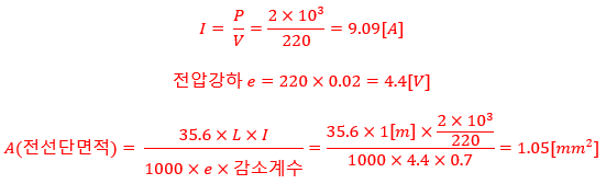 태양광어레이 분전반에서 10[m] 거리에 2[kW]의 교류 단상 220[V] 전열기를 설치하였다. 배선방법을 금속관 공사로 하고 전압강하를 2[%] 이하로 하기 위한 전선의 굵기를 얼마로 선정하는 것이 적당한가? (단, 감소계수는 0.7이다.)