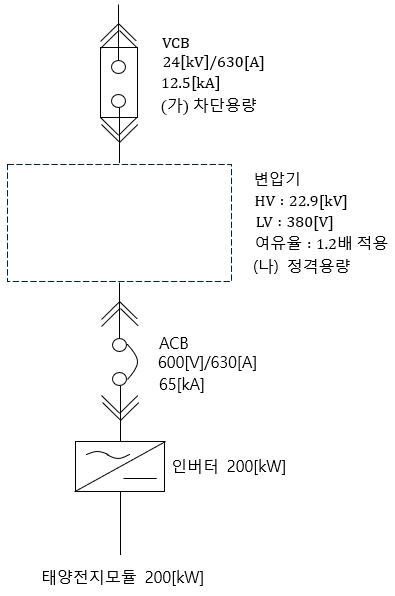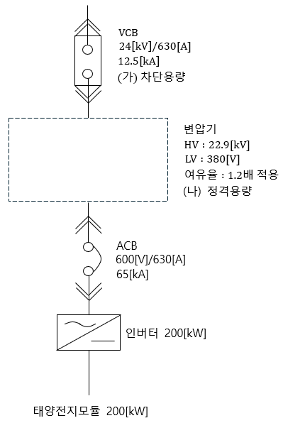 다음은 태양광발전용량 200[kW], 인버터 200[kW] 한 대를 이용하여 설계한 단선결선도이다. 그림을 참고하여 다음 물음에 답하시오.