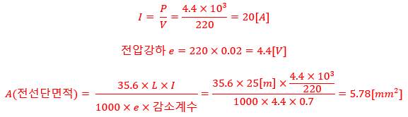 태양광어레이 분전반에서 25[m] 거리에 4.4[kW]의 교류 단상 220[V] 전열기를 설치하였다. 배선방법을 금속관 공사로 하고 전압강하를 2[%] 이하로 하기 위한 전선의 굵기를 얼마로 선정하는 것이 적당한가? (단, 감소계수는 0.7이다.)