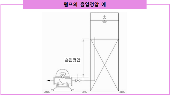 펌프의 순수 흡입수두는 유체가 흡입배관 및 부속을 지나 펌프의 임펠 러 “eye"속으로 흐르게 하는 압력수두를 말한다. 이 값은 수원이 펌프보 다 아래에 있을 경우 “대기압 - 낙차”이며, 수원이 펌프보다 위에 있을 경우에는 “대기압 + 정압”이 된다. 펌프흡입측 플랜지의 펌프운전 시의 압력계눈금은 수원이 펌프보다 아래에 있을 경우 (-)가 되지만 절대압력으로 환산하면 (+)가 되기 때문 에 NPSH (Net Positive Suction Head)라고 한다. 이 NPSH는 펌프설치 조건(낙차)과 관련되어 있음을 알수 있다.