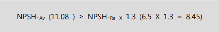 또한, 펌프의 공동현상(Cavitation) 없이 펌프를 운전하기 위해서는 NPSH-Av ≥ NPSH-Re x 1.3 이 되도록 권장하고 있다. 따라서, 펌프의 원 활한 흡입을 위해서는 가급적 NPSH-Av 값을 크게 확보하여야 한다.