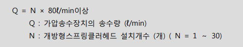 2.2.1.11 가압송수장치의 송수량은 0.1 ㎫의 방수압력 기준으로 80 L/min 이상의 방수성능을 가진 기준개수의 모든 헤드로부터의 방수량을 충족시킬 수 있는 양 이상의 것으로 할 것. 이 경우 속도수두는 계산에 포함하지 않을 수 있다.