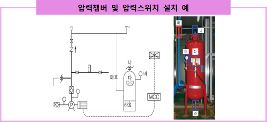 압력챔버를 기동용수압개폐장치로 사용하는 경우 압력챔버의 용량이 최소 100ℓ 이상으로, 배관내의 압력을 감지하여 충압펌프 또는 가압송수장치(펌프)를 기동시 키는 역할을 한다.