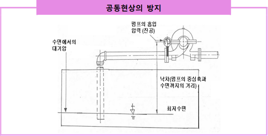 펌프가 유체를 계속해서 이송하기 위해서는 “대기압 - 흡입시의 장애요인 ≥ NPSH-Re”의 조건이 성립하여야 한다.