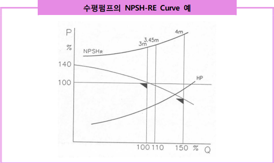 (3) 순수필요흡입수두(NPSH Required : NPSH-Re) 공동현상을 일으키지 않고 운전하는데 있어서 펌프가 필요로 하는 순수 흡입수두를 “순수필요흡입수두(NPSH Required : NPSH-Re)”라고 하고 “흡입능력”을 나타내며, 이 값은 펌프의 부하(송출유량)에 따라 변한다.