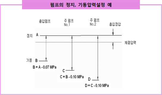 ※ 주펌프 흡입측의 최소정압은 주펌프의 중심축보다 상부에 소화수조가 있는 경우로서 소화수조의 최저수면과 주펌프의 중심축까지의 낙차를 말한다. 충압펌프의 기동압력 = 충압펌프의 정지압력 - 0.07 ㎫(0.7㎏/㎠)