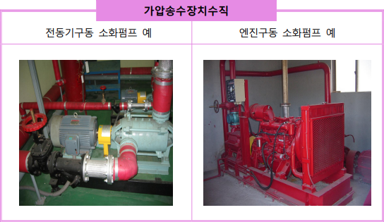 가압송수장치는 소화수에 압력을 가하여 필요한 위치까지 송수하는 장치로, 소화수에 에너지를 가하는 장치이다. 종류로는 고가수조방식, 압력수조방식, 펌프방식, 가압수조방식이 있다. 이들 방식 중 전동기를 구동장치로 이용하는 “전동기구 동 소화펌프”가 가장 일반적으로 사용된다. 그러나 전기를 전원으로 사용하므로 전원에 이상이 있을 경우에는 펌프를 운전할 수 없는 문제점이 있다. 따라서, 이를 해결하기 위하여, 전원 이상 시에 비상전원을 공급할 수 있는 비상발전기를 별도로 설치하거나, 전원의 이상유무와 관계없이 축전지를 사용하여 항상 펌프를 기동 할 수 있는 내연기관(주로 디젤엔진)을 구동장치로 하는 디젤엔진구동 소화펌프가 설치된다. 펌프방식은 상대적으로 신뢰도가 낮고 많은 부대시설이 필요하다는 단점이 있으나 소요양정 및 토출량을 임의로 선정할 수 있으며 설치위치에 제한을 받지 않는 등의 큰 장점이 있다. 디젤엔진구동 소화펌프의 경우에는 유류저장탱크가 필요하며 지정수량이상의 위험물을 저장하는 경우에는 「위험물안전관리에 관 한 법률」에 적합하게 설치 및 유지관리하여야 한다.