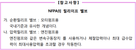 ※ NFPA 기준 : 각 소화설비별로 전용 소화펌프를 두지 않고, 소화설비용 전용으로 소화펌프를 설치하도록 규정하고 있다.