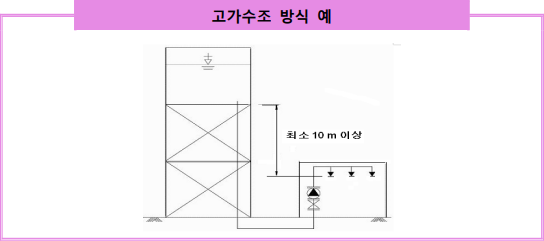 고가수조 자연낙차에 의하여 필요한 압력을 얻는 방식인 고가수조방식의 설치위치는, 소방대상물의 최상층에 설치되는 스프링클러헤드보다 상부에 설치하되, 고가수조의 하단으로부터 소방대상물의 최상층에 설치되는 스프링클러헤드까지의 높이가 10m 이상이 되도록 하여 스프링클러헤드선단에서 최소 방수압력인 0.1㎫ 이상이 걸릴 수 있도록 하여야 한다. 물론 방수압력을 0.1㎫ 이상 확보하기 위해서는 수조의 설치 높이를 “10m+마찰손실(수두)”로 고려하여야 한다. 별도의 동력원 및 비상전원을 필요로 하지 않고 신뢰성이 매우 높은 방식이지만, 고층부에서도 규정압을 발생시키려면 건물보다 높은 위치에 수조를 설치해야 하는 설치상의 난점이 있다.