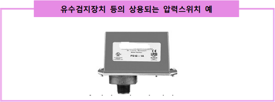 고가수조를 설치한 경우 유수검지장치의 설치위치 유수검지장치 등이 물의 흐름을 검지하는 검지압력(차압)범위는 제조업체의 사양에 따라 각기 다르므로 설치하고자 하는 제품에 대한 사양을 참고하여야 한다. 예: 압력스위치가 물의 흐름을 검지하는 검지압력(차압)범위 * 미국제품은 PS-10A : 0.27~0.4 bar