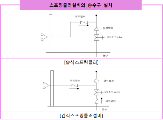 2.3.1.5 스프링클러헤드에 공급되는 물은 유수검지장치를 지나도록 할 것. 다만, 송수구를 통하여 공급되는 물은 그렇지 않다.