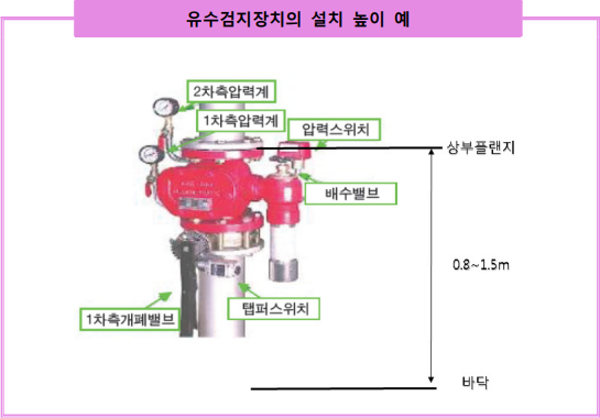 1.유수검지장치 또는 일제개방밸브의 설치 유수검지장치 등의 설치 높이 0.8~1.5m는 유수검지장치 등이 설치되는 바닥으로부터 유수검지장치의 상부 접속부 까지의 높이를 말한다.
