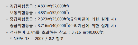 2. 방호구역의 면적 하나의 방호구역이란 스프링클러설비의 1개의 유수검지장치 담당하는 스프링클러헤드 설치부분을 말하며, 바닥면적이 3,000㎡를 초과하지 아니하도록 하고 있다. 면적기준은 방호대상물 및 스프링클러설비의 관리차원에서 정한 것으로서 스프링클러설비의 펌프용량 및 배관구경을 선정하는 수리계산 시의 살수면적(스프링클러헤드의 설치 기준개수에 해당하는 면적)과는 관계가 없다. 즉 화재발생 시 최악 의 경우에는 하나의 방호구역에서 발생되는 피해가 다른 방호구역으로 확산되지 않도록 화재발생 방호구역을 다른 방호구역과 방화구획 등으로 구분한 것이다. 국내의 경우에는 건축법령의 방화구획 기준과 맞물려 스프링클러설비의 하나의 방호구역이 바닥면적 3,000㎡를 초과하지 아니하도록 일괄적으로 규정하고 있다. 방호구역의 면적은 설비의 수리적 특성보다는 소요시간동안에 하나의 유수검지 장치로 방호해야하는 최대면적에 관한 판단에 따른 것으로 NFPA 13 기준의 경우 에는 다음과 같이 위험등급별로 하나의 방호구역의 바닥면적을 정하고 있다.
