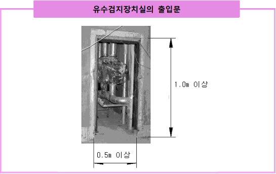 3. 유수검지장치실(전용실)의 출입문 유수검지장치 등이 설치된 곳은 필요시 관계인 등이 들어가 필요한 조치나 작업을 수행할 수 있어야한다. 설비를 재설정할 경우 급수밸브를 잠그고 배수밸브를 여는 등의 작업이 필요하므로 공간이 지나치게 협소하지 않도록 하고 접근을 쉽게 하기 위하여 출입문의 최소 크기를 규정하였다.